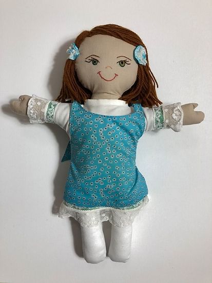 Petal Doll with Red Hair, Green Eyes, Blue Flowered Jumper with White Blouse